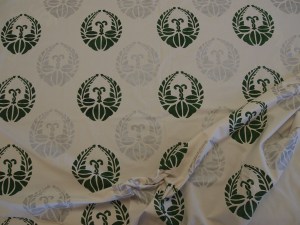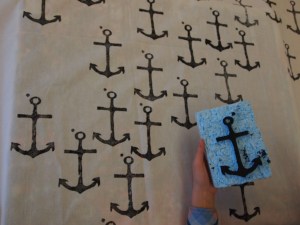 Ankkurit. Tein palikkapainannalla mustia ankkureita valkoiseen kankaaseen. Mustavalkoiseen päädyin, koska ajattelin sen soveltuvan paremmin eri käyttötarkoituksiin vaikka se onkin aika klassinen väriyhdistelmä. Halusin painaa kankaan täyteen jollain tietyllä symbolilla ja idea ankkurista tuli sattumalta mieleeni. Teimme aluksi kokeiluja eri tekniikoilla. en ollut ennen kokeillut palikkapainantaa, mutta se vaikutti mielenkiintoiselta miten kaivertamalla sai tehtyä erilailla yksityiskohtia. Lisäksi viehätyin siitä, miten painannan jälki ei ole ihan tasainen. Painamani kuva oli iso palikkapainannaksi, mutta mielestäni siinä ei ollut mitään ongelmaa työn onnistumisen kannalta. (Tosin joissakin kohdissa olisin voinut kohdistaa palikan tasaisemmin kankaaseen, jotta pieniltä lipsahduksilta olisi vältytty…) Annika