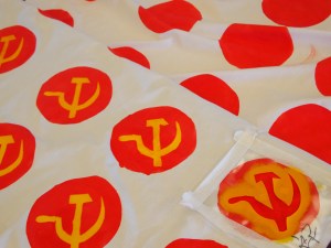 Neuvostoliittolainen twister – vasen käsi punaiselle. Aluksi työ eteni hienosti. Loppua kohti sabloona käpertyi reunoista ja aiheutti murheita taitteluista huolimatta. Olen tyytyväinen lopputulokseen kaisesta huolimatta ja mietin kovasti käyttötarkoitusta kankaalle uudessa asunnossani. Tatu