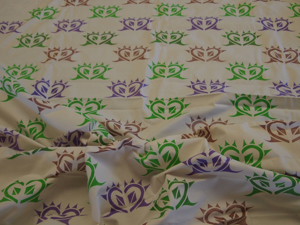 Yritin sovittaa sydämen ensin käsien sisään, mutta se ei onnistunut. Otin kangasta reilusti, vaikka kuvio oli pieni. Painoin kuviota kolmella eri värillä: violetti, vihreä, kupari. (Pidin niistä väreistä). Aluksi mietin millä tavalla painan kuviota, mutta sitten päädyin riveihin (tasaraportti). Kuviot onnistuivat hyvin lukuunottamatta pieniä virheitä. Mikähän voisi olla kankaan nimi? Piikikäs rakkaus, Isku sydämeen? Nimeksi tuli Vahva sydän. Jemina