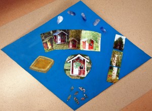 Kollaasin aihe on syksy ja en valinnut kollaasin taustaväriksi oranssia taikka ruskeaa, vaan sinisen. Mielestäni kyseinen väri ei ole mikään perus syksynväri, mutta jotenkin koin sen sopivan kollaasiin. Kollaasissa on pääaiheena leikkimökki ja sen ympäristö. Keskellä kollaasia on kuvattu leikkimökki osissa ja osittain se on myös maalattu. Oikeassa reunassa on kuvattu koivu kolmeen osaan. Ylhäällä kollaasissa on pilviä ja alhaalla maassa, kuten syksyyn kuuluukin, syksyn lehtiä. Ylhäällä on kuvattu leikkimökkiä eri aikoina syksyn kuluessa. Kaikki kuvat on muokattu hieman erinäköisiksi. Halusin kollaasin vielä jotain, mikä oikein kunnolla kuvastaisi sitä, että kollaasissa on ihka oikea lasten leikkimökki eikä mikään koriste. Maalasin kollaasin vasempaan reunaan hiekkalaatikon, jonka sisällä on oikeaa hiekkaa. Halusin kollaasille hiukan omaperäisemmän muodon, joten leikkasin sen salmiakkikuvion muotoiseksi. Sonja
