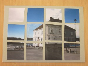 Raahen museo. Kollaasissa on kuvia aamusta iltapäivään ja erilaisten säiden aikaan. Kuvat on otettu erilaisista kuvakulmista ja koottu niistä yhdeksi isoksi kuvaksi. Oli toisaalta helppo, mutta mukava tehtävä. Vaikeinta oli päättää mistä ottaa kuvia. Työhön olisi voinut tehdä muillakin tekniikoilla jotain kuten esim. maalata, liimata roskia, mutta nyt se jäi sitten tekemättä. Esa