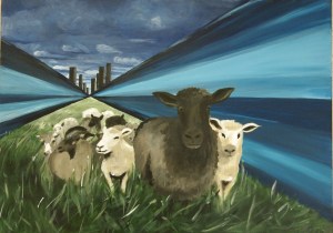 Voisiko tulevaisuudessa kaupunki ja maaseutu kohdata näin? Lampaiden laidunmaaksi on hyödynnetty kiitävien junien välinen ratapenkka. Akryylivärimaalaus 50x70, Miia.