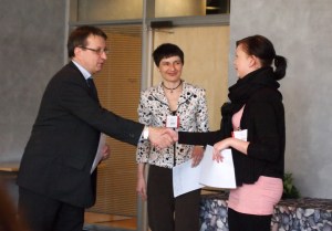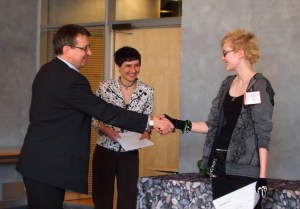 IBM:n ja HYOL:n edustajat onnittelevat lukiosarjan toiseksi tullutta Miia Tervoa. Lukiosarjan toiseksi tullut sai 300 euron palkinnon. Miian akryylivärimaalaus käsitteli tulevaisuuden kaupunkia – maaseudun ja urbaanin ympäristön suhdetta.