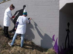 Koko projekti oli minusta mukava. Kun tietää että on mahdollisuus saada oma työ moneksi vuodeksi näkyviin, on ihan erilainen motivaatio suunnitella sitä. Työ onnistui mielestäni hyvin, mutta mua häiritsee, että osa varjohahmoista oli ihan eri tyylisiä kuin toiset. Olisin kaivannut yhtenäisyyttä. Hyvin onnistui minun mielestänä maalipurkit ja suurin osa varjoukkeleista. Yllätyksenä tuli se kuinka matala alikulkutunnelin seinä oli.