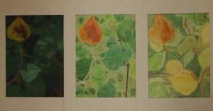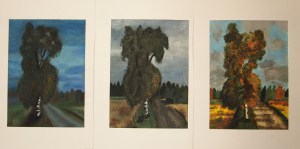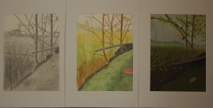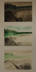 Maisema on rannasta lukion läheltä. Kaksi kuvista on tehty akryyliväreillä ja yksi kuivapastelleilla. Kristiina