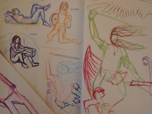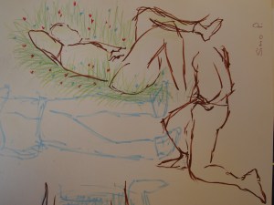 KU4-kurssilla tehtiin harjoitustöinä croquis-piirroksia. Ihmisen piirtäminen kehittää havainnointikykyä ja havaintojen siirtämisessä paperille kehittyy nopeasti, niin että mittasuhteet alkavat olla kohdillaan tai ainakin piirrosviivassa on uudenlaista lennokkuutta…