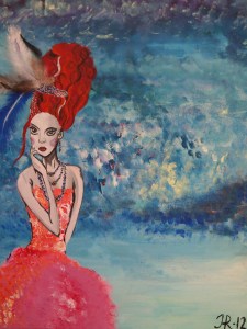 Hahmo on tarkoituksella jätetty valkoiseksi enkä edes pyrkinyt tekemään siitä anatomisesti oikeaoppista. Maalauksen värimaailma kuvastaa hyvin elämänasennettani. Tumma tausta edustaa elämän vaikeimpia hetkiä ja pinkki mekko ja valkoinen hahmo puolestaan kuvaavat iloisuutta, viattomuutta ja puhtautta. Halusin tämän kautta välittää yksinkertaisesti ajatusta siitä, että vaikka elämässä menisi kuinka huonosti niin aina voi löytää jotain positiivistakin.