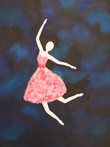 Hahmon nukkemaisuus puolestaan edustaa menneisyyttäni. Paljas, väritön nukke kuvaa ihmistä, joka ei ole vielä löytänyt omaa paikkaansa maailmassa tai hyväksynyt itseään ja on täysin muiden ihmisten vietävissä ja muokattavissa. Tanssijamainen asento kertoo pitkäaikaisesta haaveestani ryhtyä harrastamaan tanssia, joka ei ainakaan vielä toistaiseksi ole tapahtunut. Pinkistä mekosta löytyy elämänasenteeni kuvaamisen lisäksi myös muita merkityksiä. Halusin tuoda sillä työhön feminiinisyyttä, mutta toisaalta pinkki on yksi lempiväreistäni. Mekko itsestään edustaa rakkauttani kermakakku- ja prinsessamekkoihin 🙂 Kubistisuutta työhön tuo vähän hahmon ja taustan suhde, josta näkyy eri aikojen yhdistelyä.