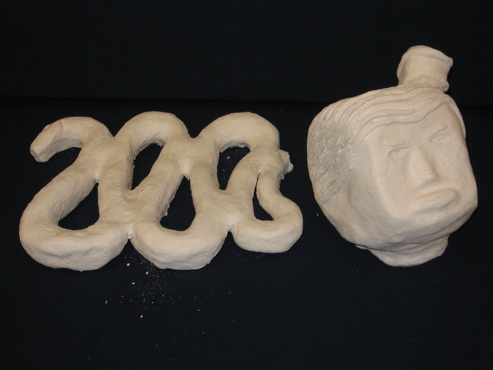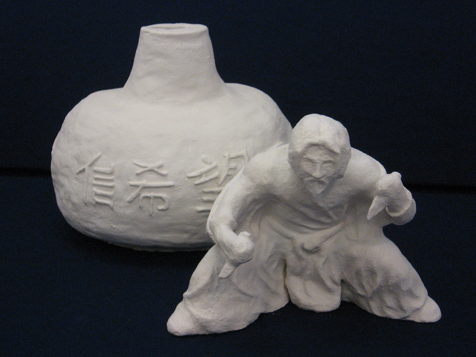 Keramiikkaveistoksessa on tutkittu kankaan laskostumista ´draperiaa´ja taisteluun jännittyneen ihmisen anatomiaa. Matias. Suurikokoisen ruukun kyljessä on kiinalaisia kirjoitusmerkkejä.