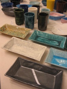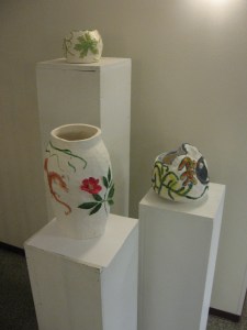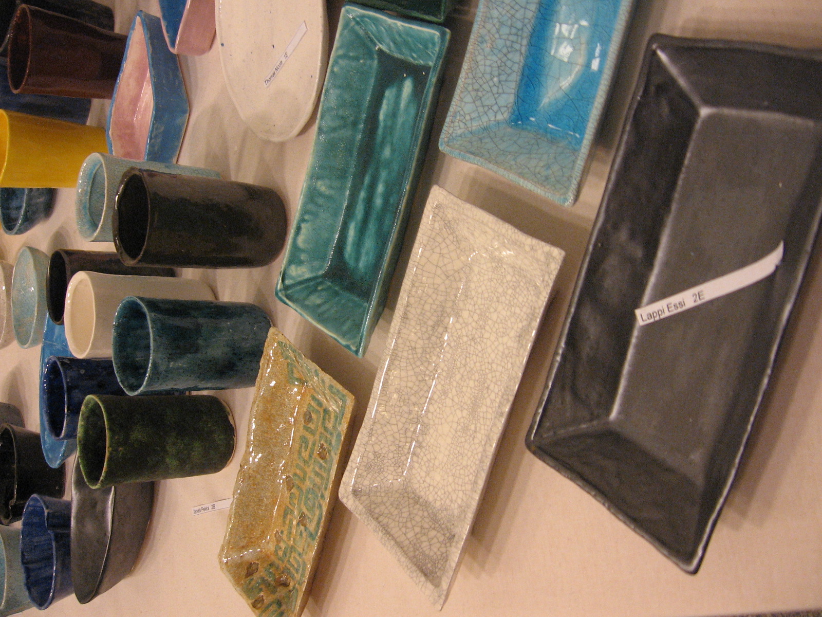 Lasitusharjoituksia valusaviastioihin. KU9 Kuvanveisto- ja keramiikka -kurssin näyttely koulun pääportaikossa.