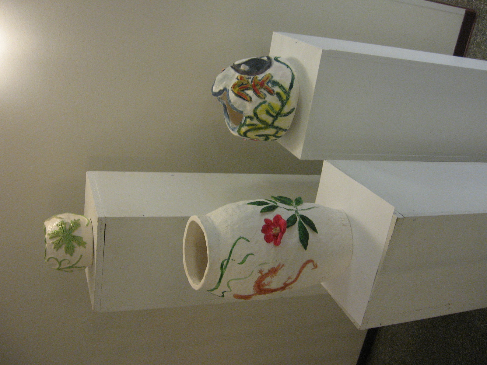 Etualalla on kiinalaisaiheinen ruukku, jossa kuva-aiheina on lohikäärme ja pionit. Pioni sen takia, koska se on kiinan kansalliskukka. Ruukusta tuli aika iso, koska sitä oli hauska tehdä ja se vain tuntui kasvavan kuin itsestään. -kristiina