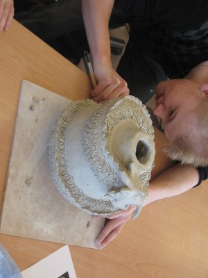 Juho viimeistelee makkaratekniikalla käsinrakennettua keramiikkaruukkua. Ruukun pinnalla kiemurtelee kiinalainen lohikäärme.