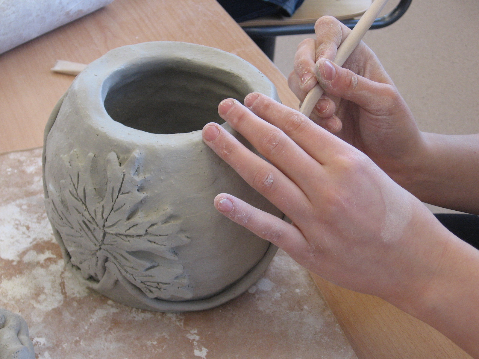 Keramiikkatyön koristeaiheeksi sai valita Kiinan kulttuurin tai koristelun saattoi tehdä myös konkreettisemmasta aiheesta, luokassa kasvavasta tuoksupelargonian lehdistä.