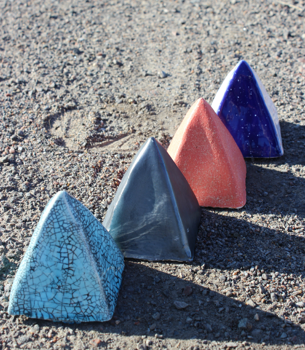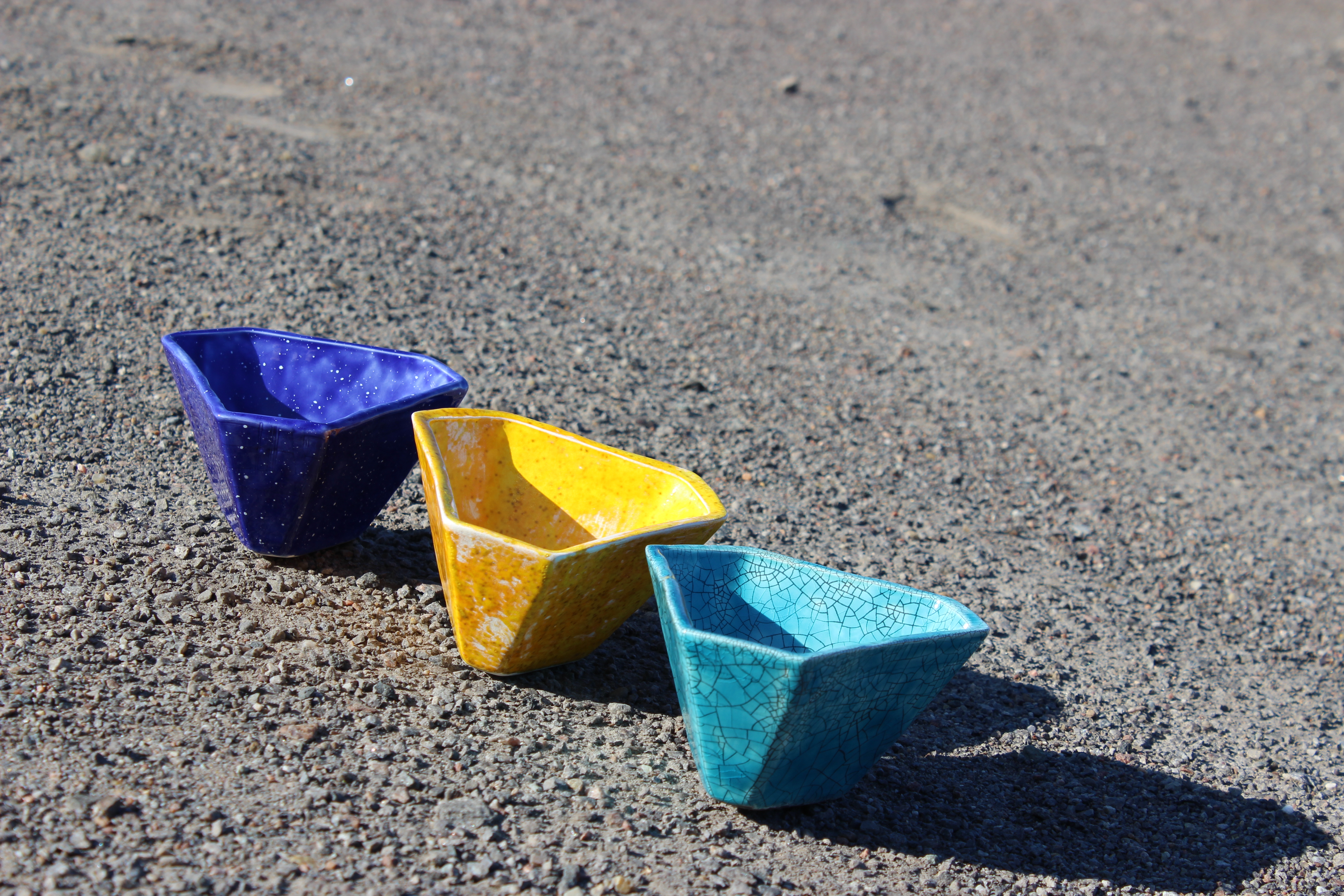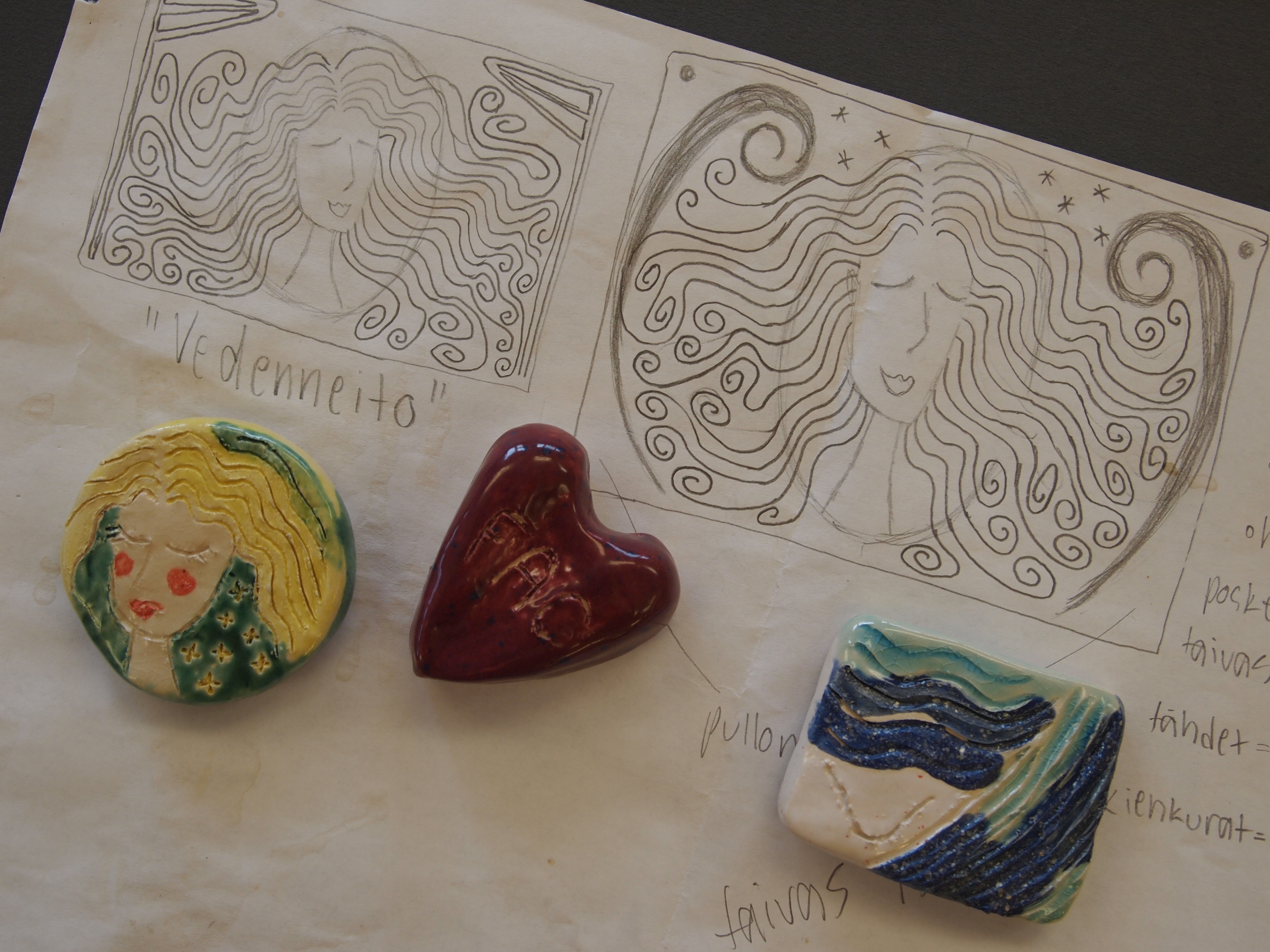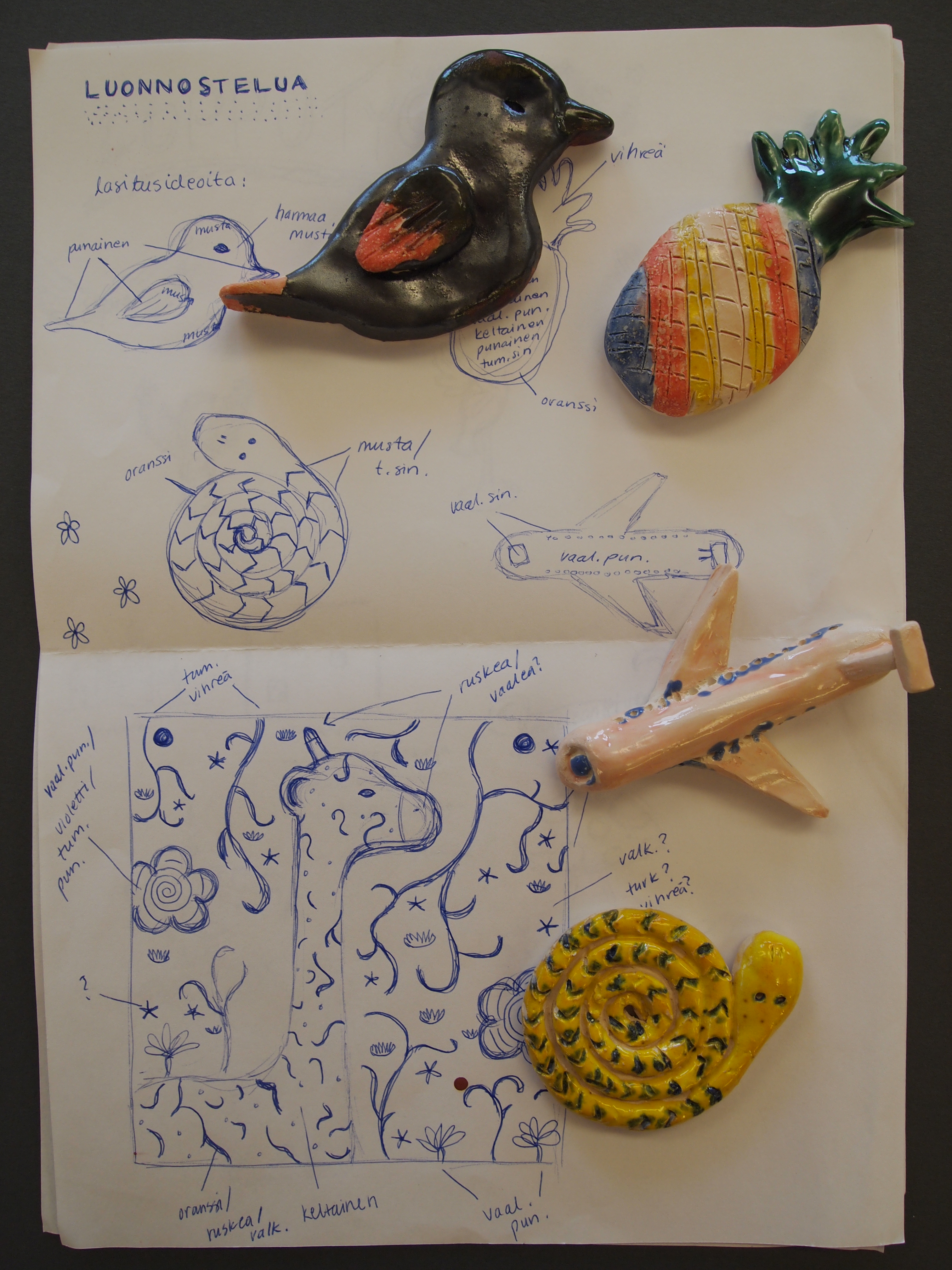 Venlan luonnoksia ja lasituskokeiluja. Lasituskokeiluista saatoi tehdä kauniita jääkaappimagneetteja.