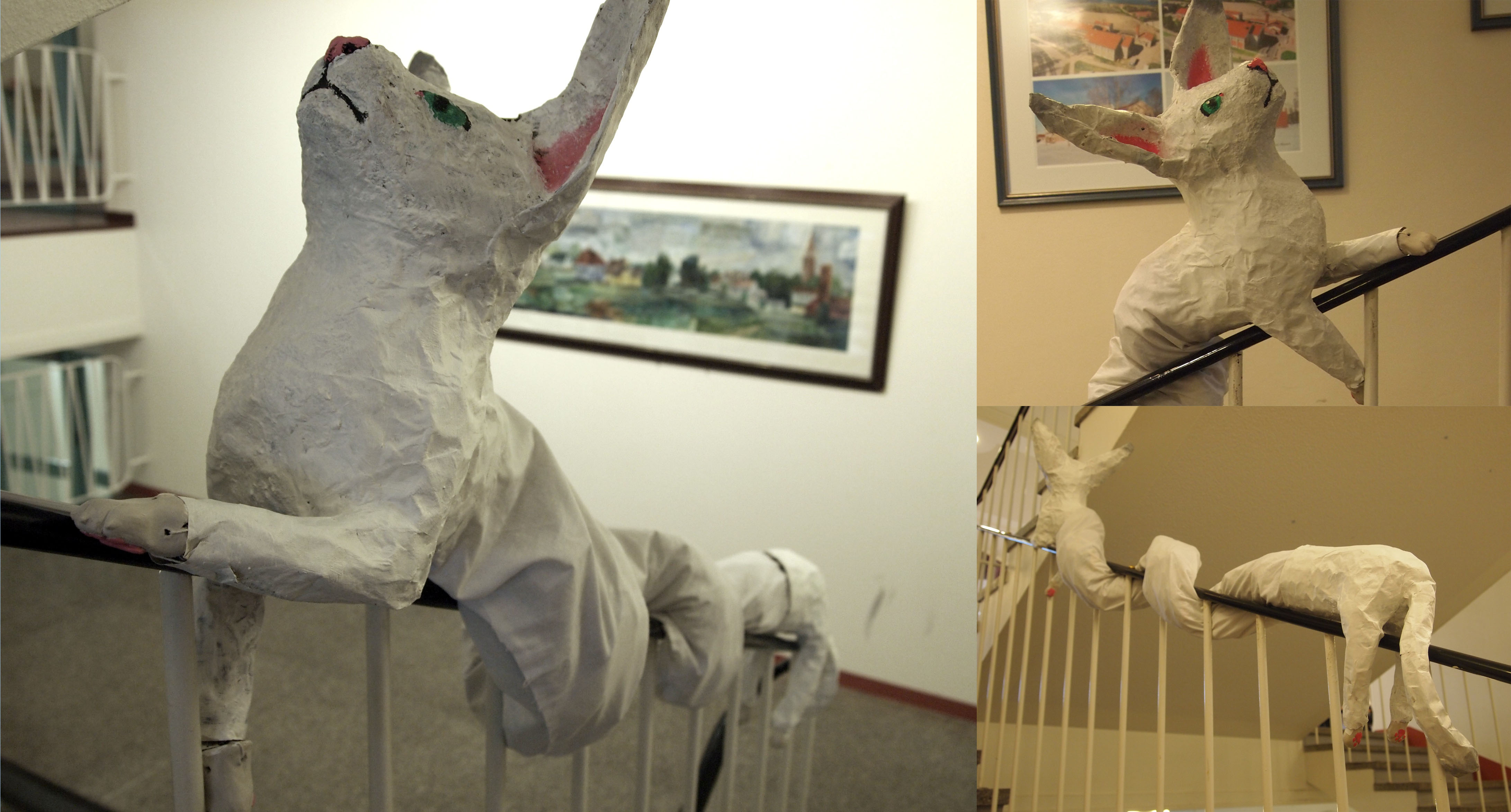 Pitkulakissa kiipeilee koulun käytävillä. Tassut savea, ruumis kangasta ja etu-, sekä takapää kanaverkkoveisto-tekniikalla. Riikka ja Pasi
