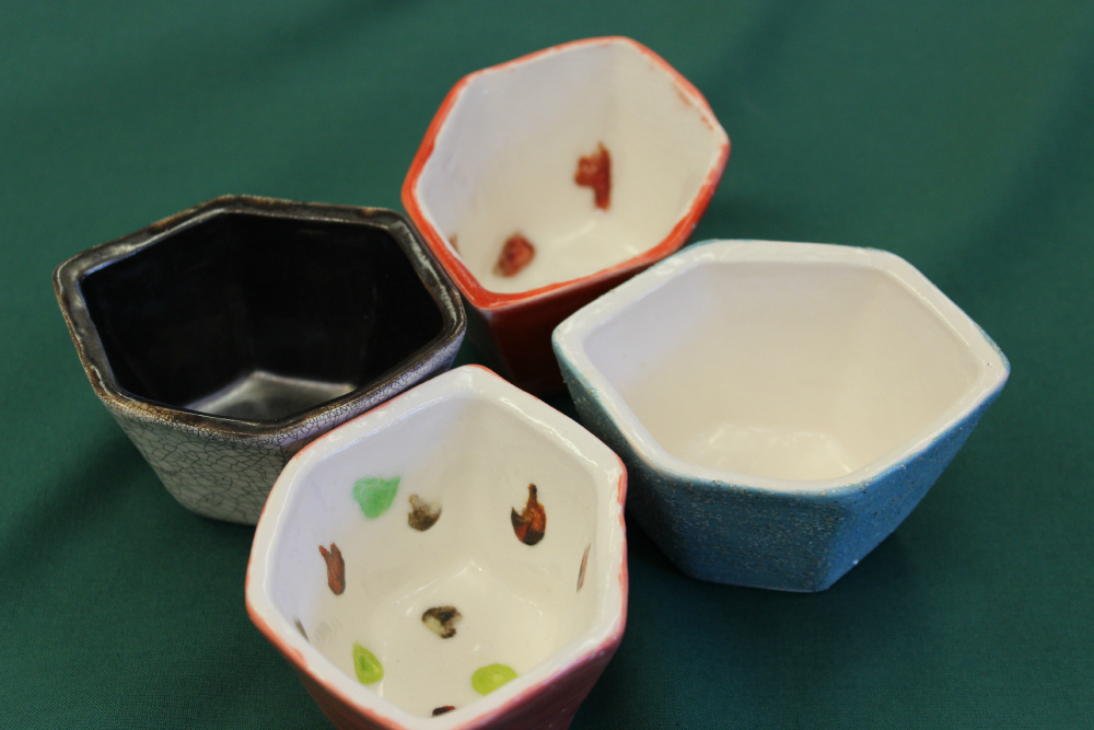 KU2-kurssilaisten tekemiä ruukkuja, joiden koristeaiheina on Kiina tai vaihtoehtoisesti luokan sitruunalle tuoksuvan pelargonian lehdet.