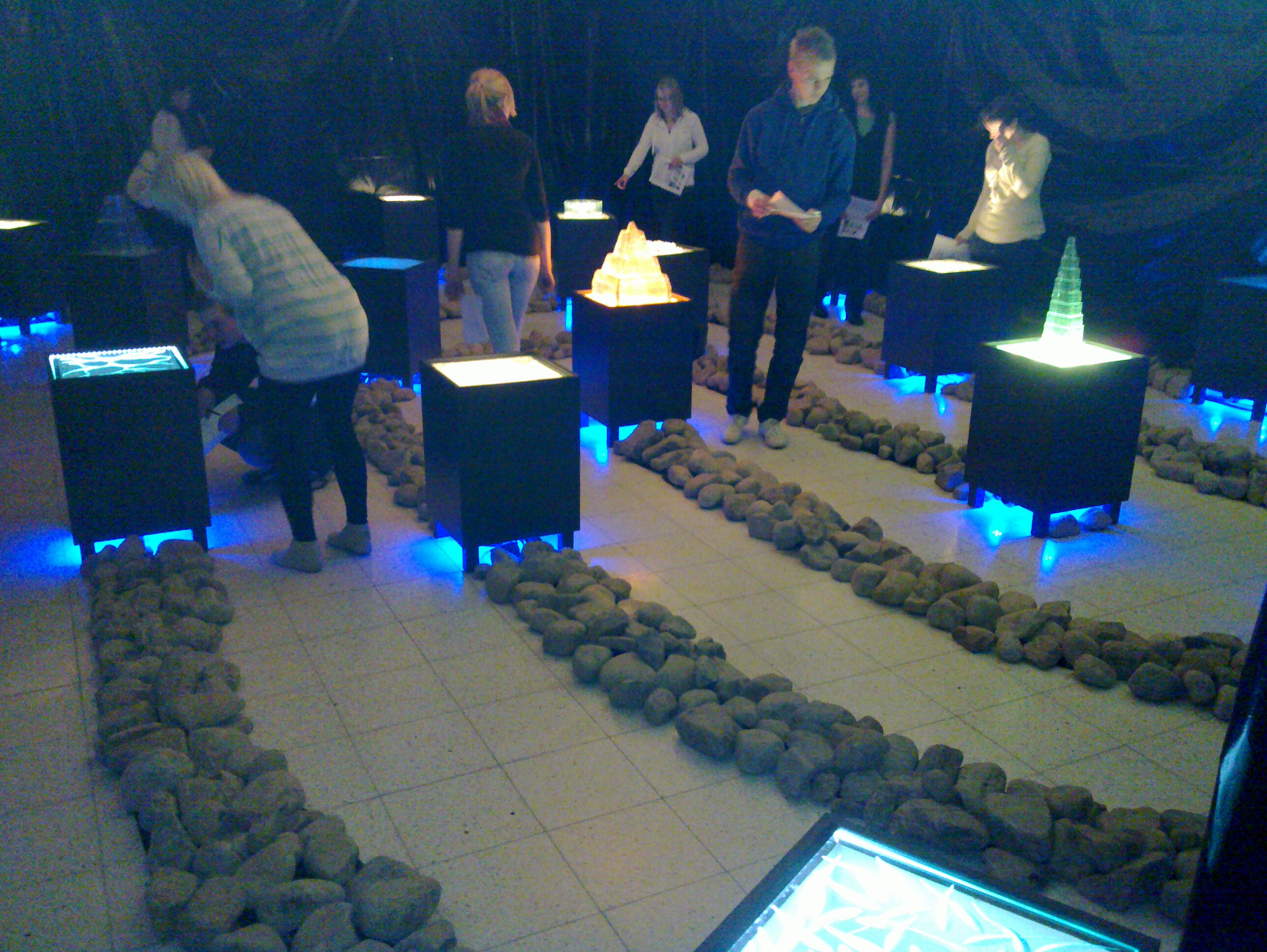 Galleria oli omituisen jännittävä ja siihen oli tehty ovela tunnelma musiikilla ja valotehosteilla. Erittäin hieno kokonaisuus! Opin sen, että lasia voi liittää monella tavalla moniin materiaaleihin ja että valoilla voi muokata tunnelmaa hienosti. Ville