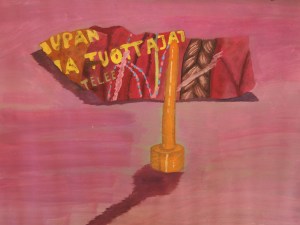 Satuin löytämään kävelykadulta vanhan ilmapallon, jossa oli vielä vähän ilmaa. Löysin ojasta myös littaantuneen tripin, jonka muodon ajattelin antavan haastetta maalaamiseen. Halusin löytää värikkäitä roskia, jotta pääsisin leikkimään värien sekoittelun kanssa. Varjostukset tekivät työstä haastavan. Annika.