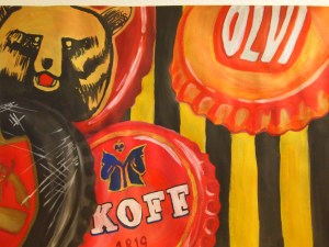 Löysin koulun lähiympäristöstä kivan värisen Daim -karkkipussin ja Fantan korkin. Oli kiva kokeilla uutta maalaustyyliä. Haastavinta työssä oli varjostukset. Jonna