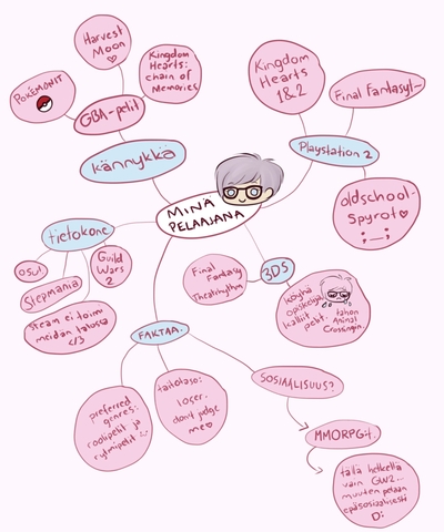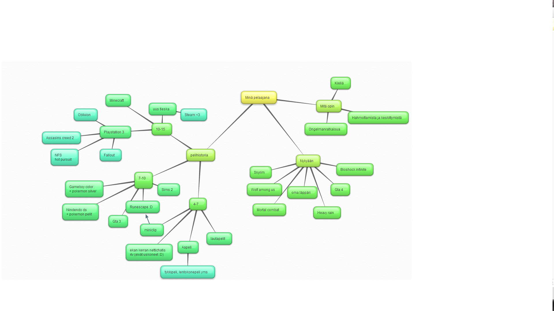 Pelikurssilaiset tekivät ensimmäisillä tunnilla esittelyt miellekarttoina, sähköisinä mindmapeina teemalla ´minä pelaajana´. Teknisiä ohjeita mindmapin sähköiseen tekemiseen ei annettu kuin oppilaan pyytäessä, jotta internitin lukuisat työvälineet saatiin monipuoliseen käyttöön – miellekartoista tulikin monenkirjavia. Osa halusi piirtää käsin, skannata ja jatkaa työstämistä tietokoneella. Ulkoasua tärkeämmäksi koettiin kuitenkin pelikulttuurista ja omasta pelaamista puhuminen, sekä tutustuminen toisiin kurssilaisiin uudesta näkökulmasta.