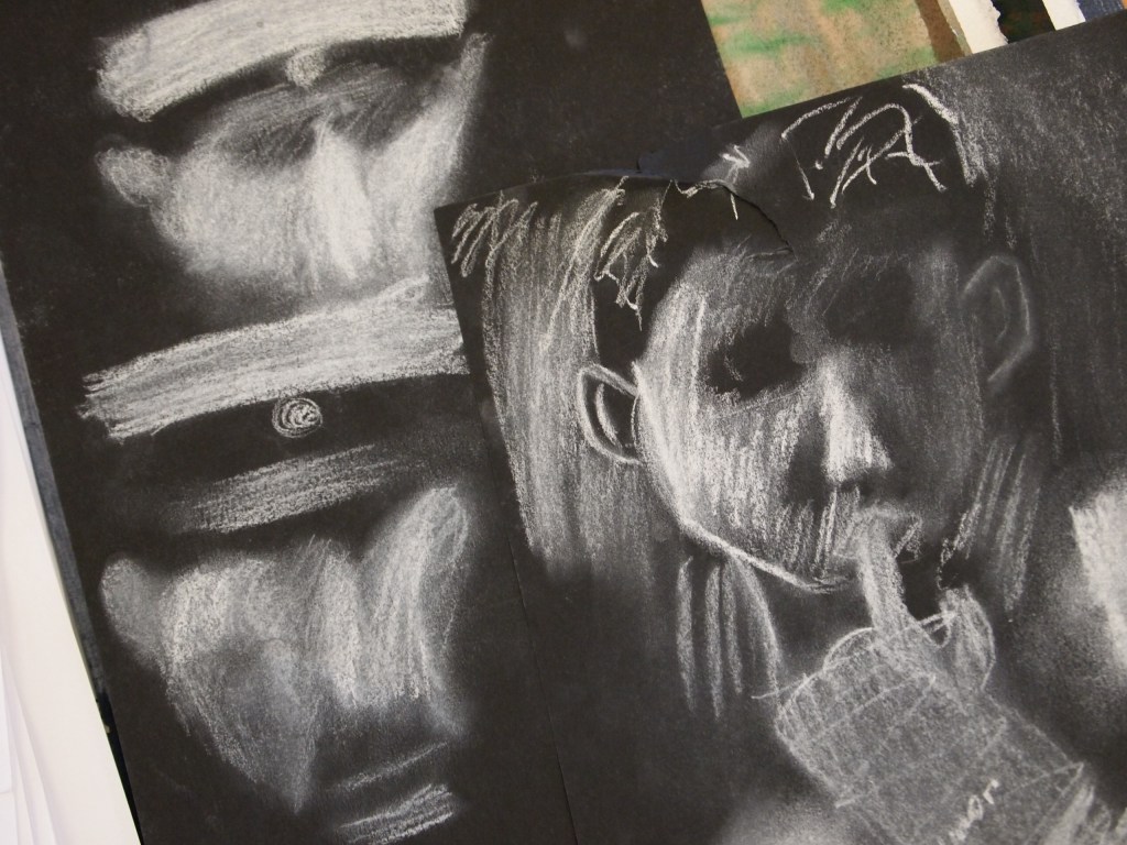Aivan perinteisiä hiili- tai lyijykynäpiirroksia ei tällä kertaa tehty. Valööreitä tutkittiin kuivapastelliharjoituksena. Näetkö yksiväristä, monokromaattista työtäsi tehdessä eri tummuusasteet kuluneen kipsireliefin pinnalla?