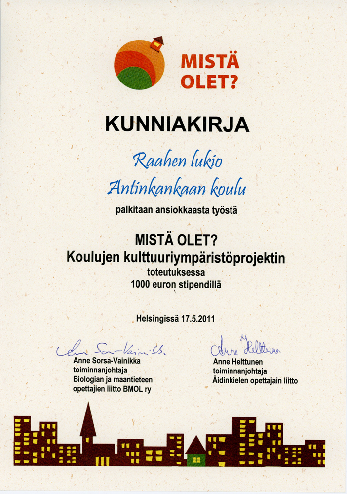 Koulujen kulttuuriympäristöprojektin arviointiraati päätti palkita 1000 euron stipendillä kolme parasta Mistä olet?– verkkosivuille kerätyistä opetuskokonaisuuksista. Raahen lukion KU6-ryhmän ja Antinkankaan koulun 6. luokkalaisten yhteisprojekti oli yksi palkituista!